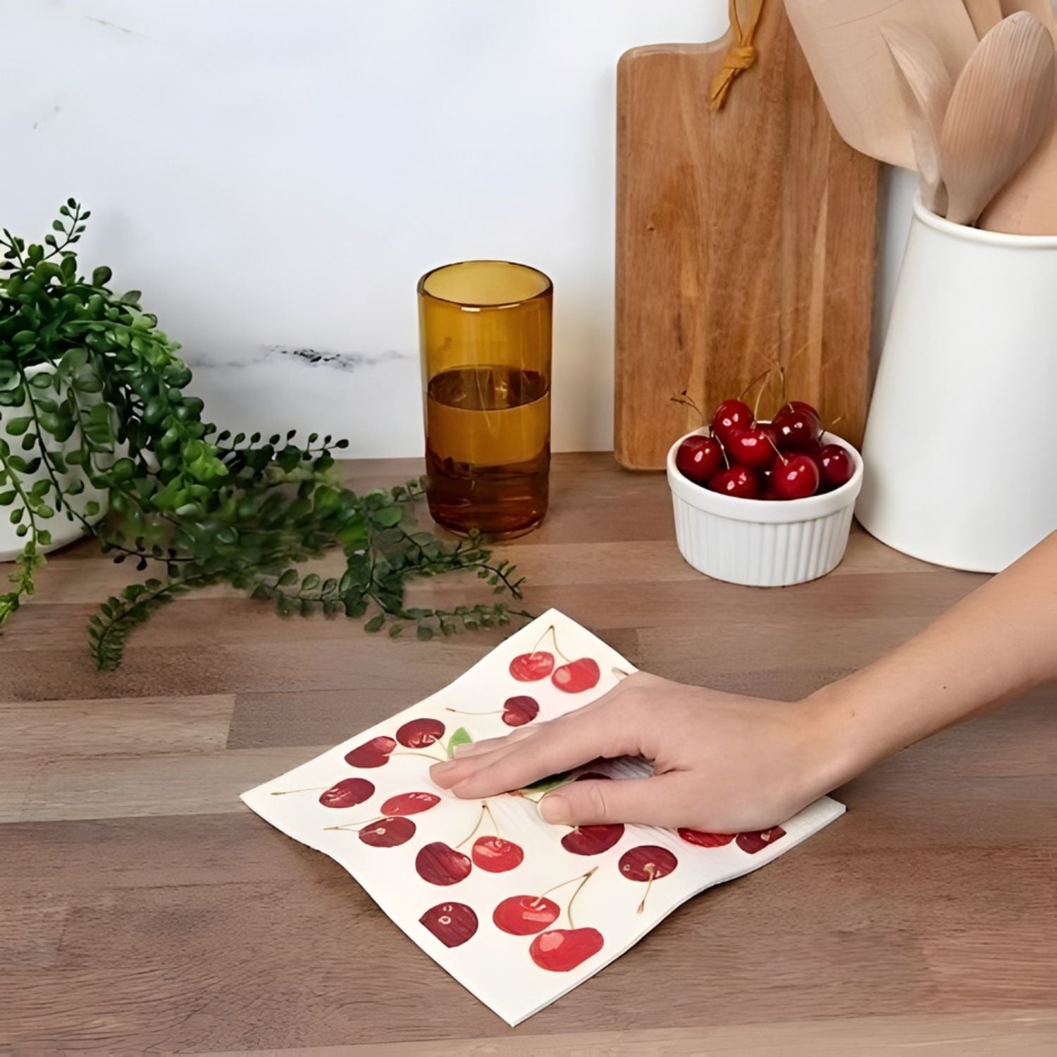 With proper care, one cloth can last over 7 months. It can be washed in the dishwasher or washing machine up to 50 times. If you hand-wash dishes often, simply rinse thoroughly after each use to avoid grease and soap buildup, which can shorten its lifespan. Most people prefer to refresh their cloth every 2–3 months — and when you’re ready, it can be composted.